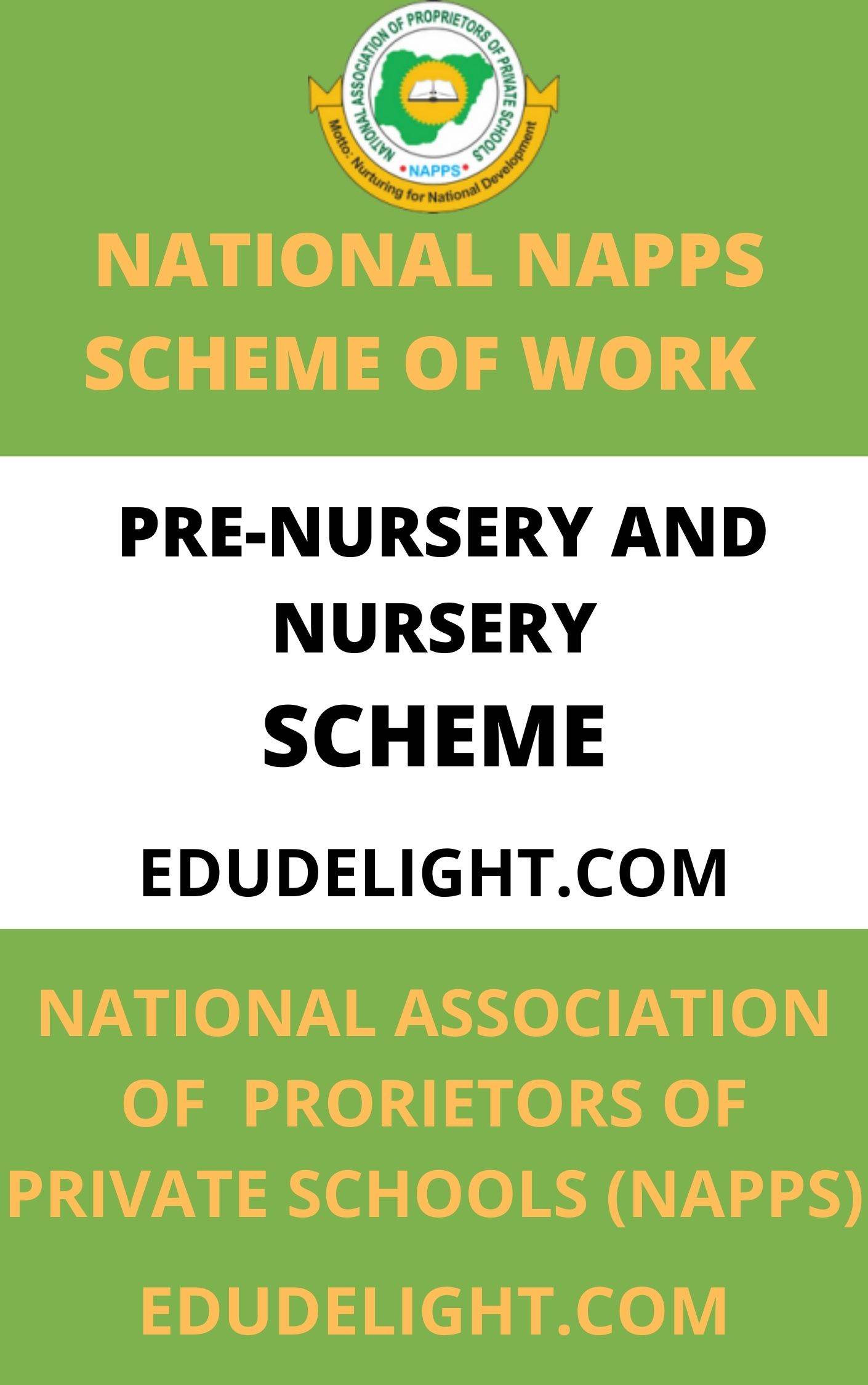 The National Association of Proprietors and Private Schools (NAPPS) Scheme of work provide seamless teaching and learning platform for private pre-schools and basic schools in Nigeria. It is designed to meet and to raise the standard of teaching in Nigerian Private Schools. this scheme is inline with the Federal Government’s approved curriculum.